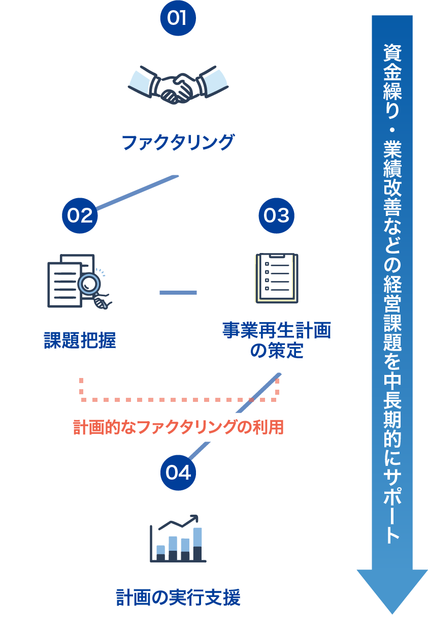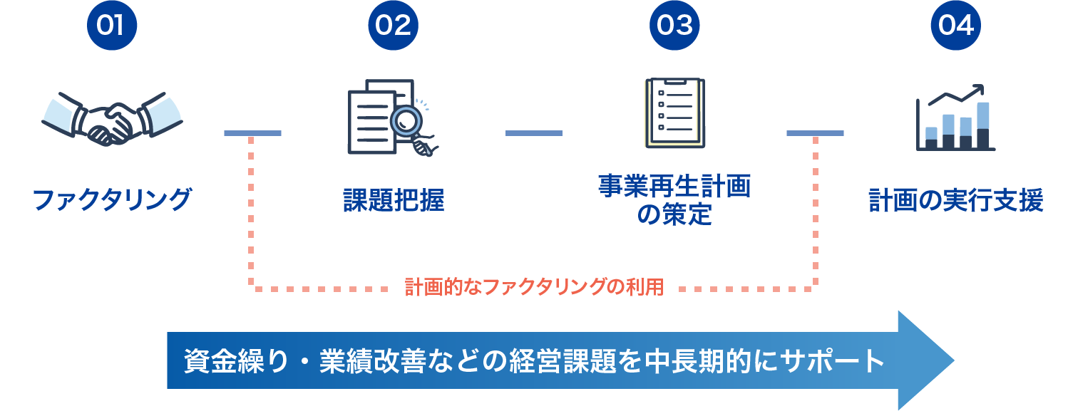 最終的には「ファクタリングの卒業」を目指し、継続的な経営フォローを行いながら、お客様の事業再生・成長を伴走支援します。