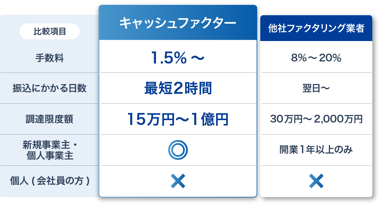 他社のファクタリングサービスに不満がある方、手数料が高い、対応が遅い、条件が不透明... そんな悩みをキャッシュファクターで解消できます。